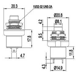 Specifications: Housing Material: Anodized aluminum Button Material: Thermoplastic Contact Resistance: <50mW (Initial) Dielectric Strength: 1000V for 1 minute Operating Force: ~4 lbs (18N) or 2.5 lbs (11N) OperatingTemperature: -55~+85oC (-67 ~185oF) Mechanical Life: 1 million (operatings) Electrical Life Resistive load 10A 100,000 (operations) (@28VDC or 115VAC): Resistive load 15A 25,000 (operations) Inductive load 5A 100,000 (operations) Lamp load 3A 100,000 (operations) Degree of Protection: IP68 |